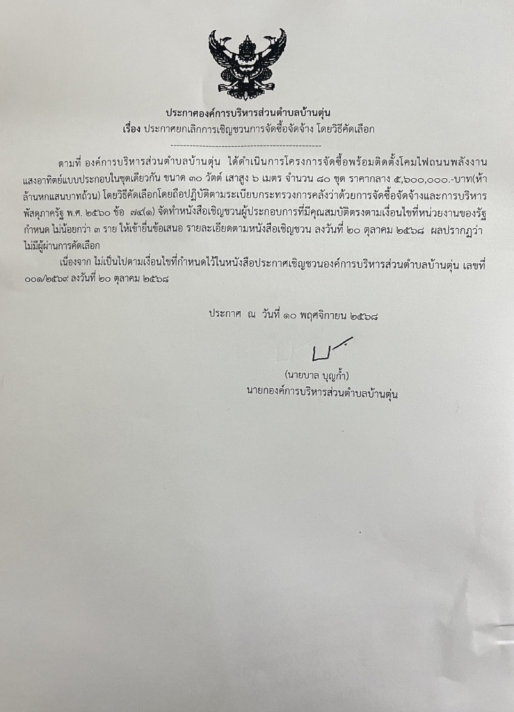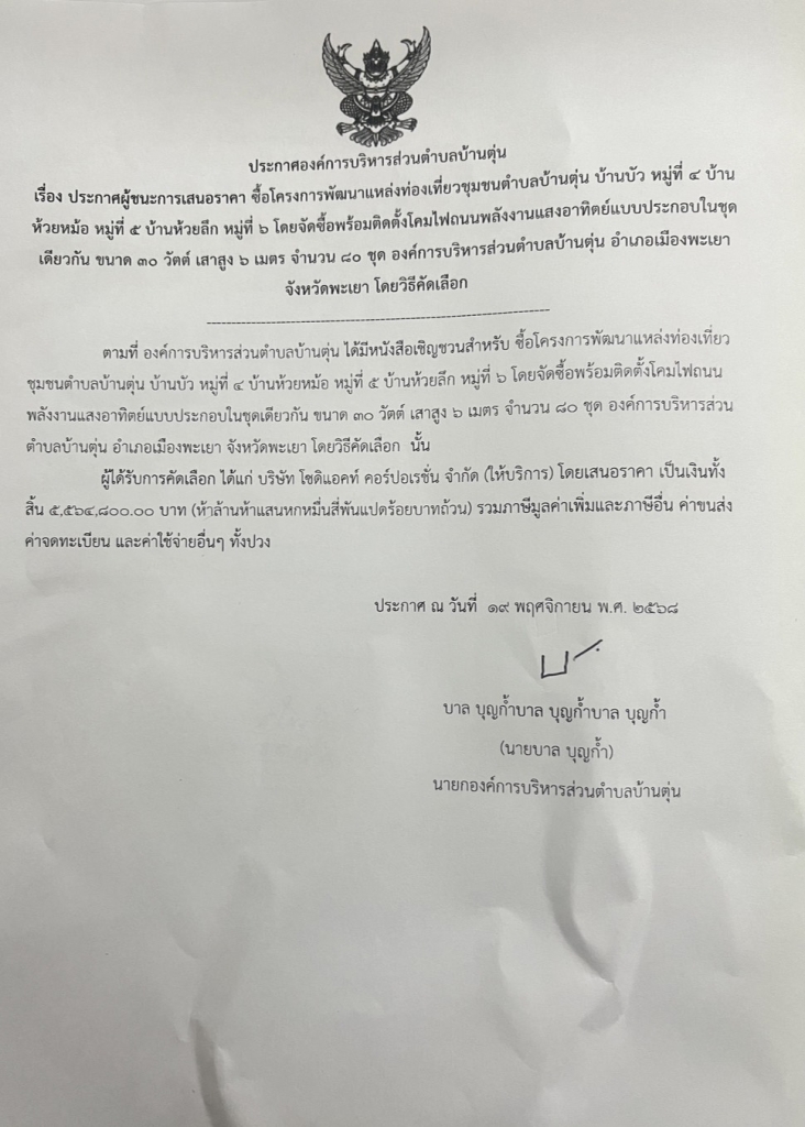 -:- ประกาศองค์การบริหารส่วนตำบลบ้านตุ่น เรื่อง ประกาศผู้ชนะการเสนอราคา ซื้อโครงการพัฒนาแหล่งท่องเที่ยวชุมขนตำบลบ้านตุ่น บ้านบัว หมู่ที่ ๔ บ้านประกาศองค์การบริหารส่วนตำบลบ้านตุ่นห้วยหม้อ หมู่ที่ ๕ บ้านห้วยลึก หมู่ที่ ๖ โดยจัดซื้อพร้อมติดตั้งโคมไฟ ถนนพลังงานแสงอาทิตย์แบบประกอบในชุดเดียวกัน ขนาด ๓๐ วัตต์ เสาสูง ๖ เมตร จำนวน ๘๐ ชุด องค์การบริหารส่วนตำบลบ้านตุ่น อำเภอเมืองพะเยา จังหวัดพะเยา 19 พฤศจิกายน 2568 |